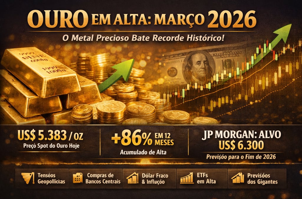 Preço do ouro hoje em março 2026 supera US$ 5.380/oz com alta de +86% em 12 meses. Descubra os motivos da disparada, como investir em ouro no Brasil (físico, ETF ou fundos) e se ainda vale a pena em 2026. Análise atualizada + tabela comparativa.